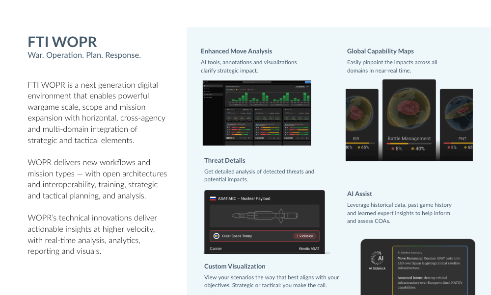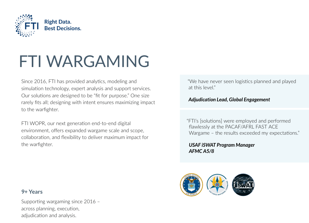 Join DoD defense and mission leaders who rely on FTI for advanced technology and expert-supported wargaming across planning, execution, adjudication and analysis. We integrate advanced modeling, AI-enhanced analytics, and decades of operational insight to support faster, smarter, mission-aligned decisions.